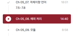 - except 블록: try 블록에서 특정 예외가 발생했을 때 실행될 코드를 넣습니다.