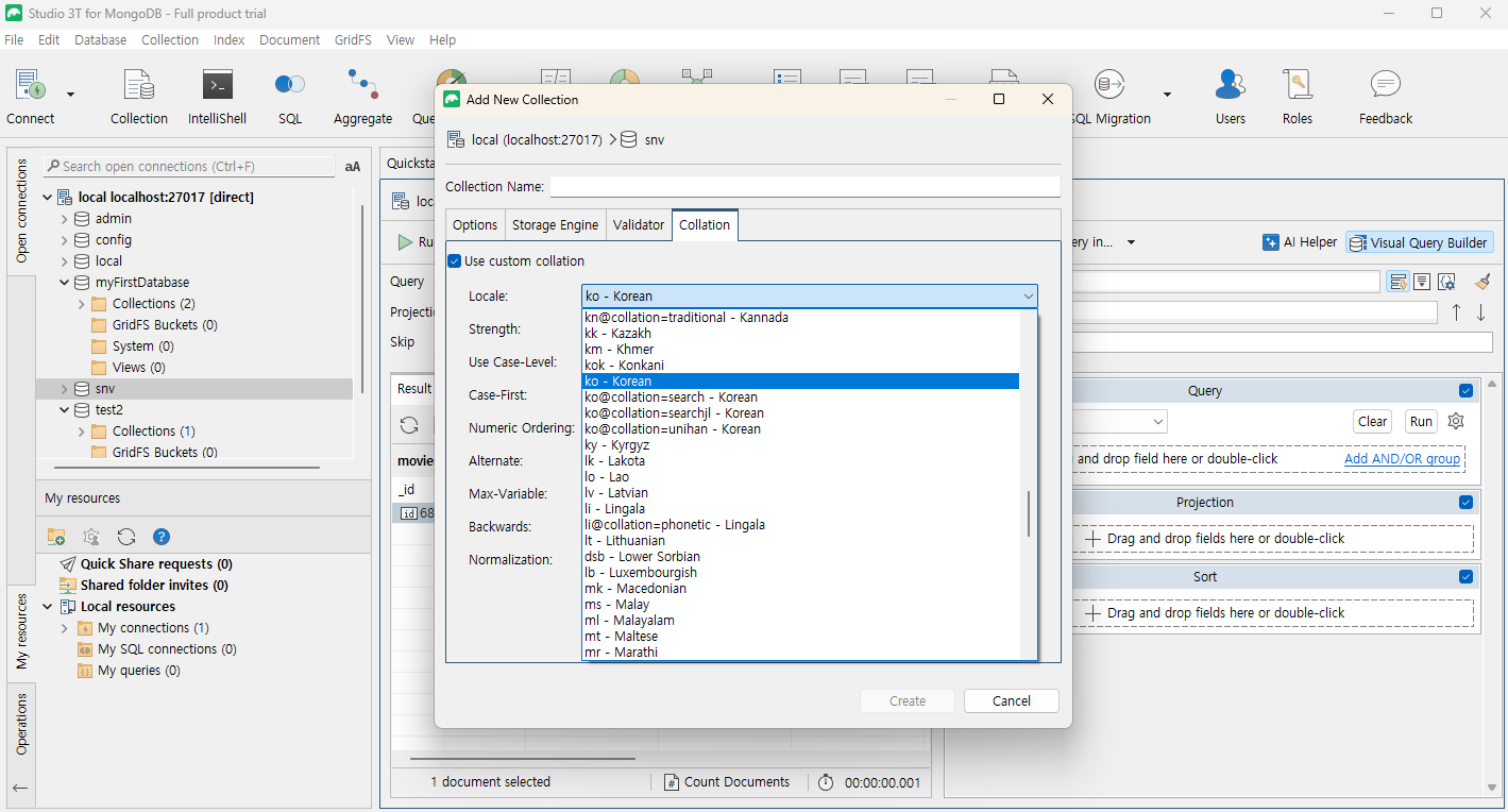 - GUI로 DB 및 Collection 생성 (한국어 Collation 설정 팁!)