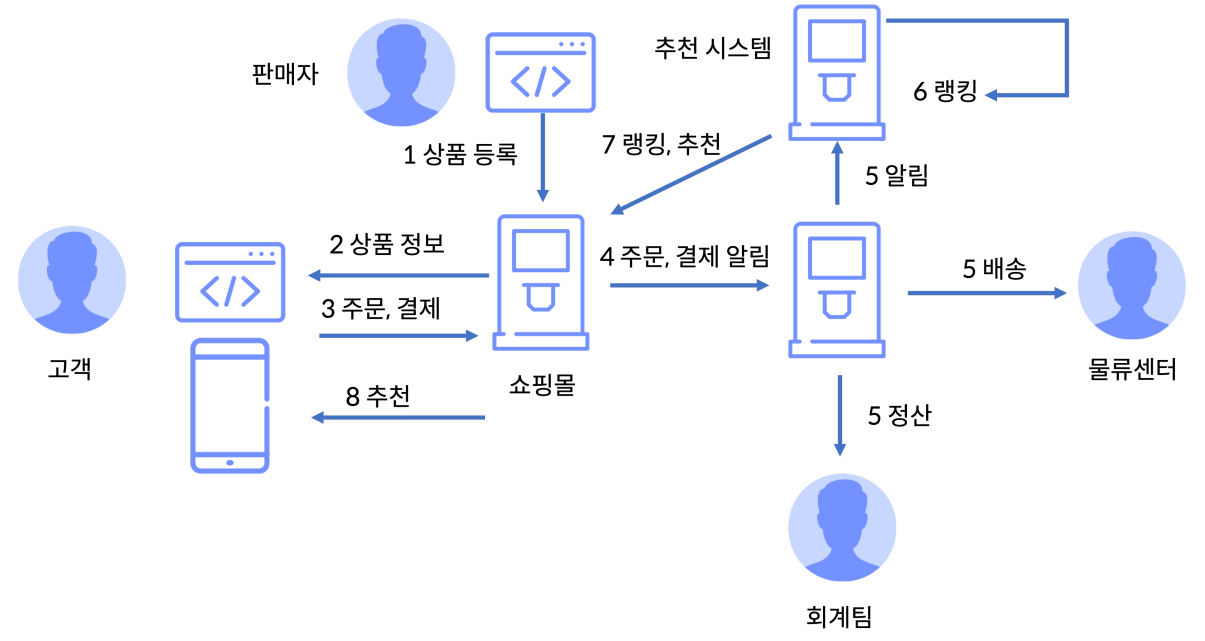 - 쇼핑몰 ➡️ 내부 시스템: 주문, 결제 알림